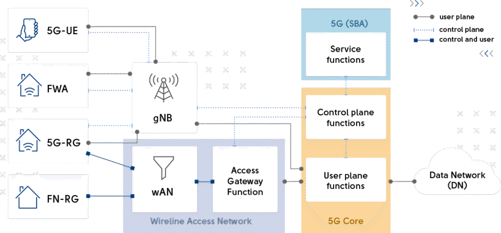 The project facilitates the AGF within a 5G Core (5GC) using Third-Generation Partnership Project (3GPP) standards. Unlike current wireline broadband networks, which treat policy and subscriber databases as separate components, the 5G Service-Based Architecture (SBA) aligns elements such as the Policy Control Function (PCF) and Authentication Server Function (AUSF) across mobile, fixed wireless, and wireline access networks. This alignment supports common infrastructures like the IP Multimedia Subsystem (IMS) for delivering rich multimedia services.
